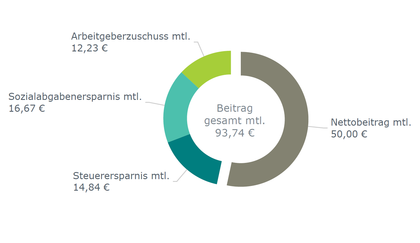 Die Beiträge sind bis 8 Prozent der Beitragsbemessungsgrenze (West) in der gesetzlichen Rentenversicherung steuerfrei und bis 4 Prozent sozialversicherungsfrei.